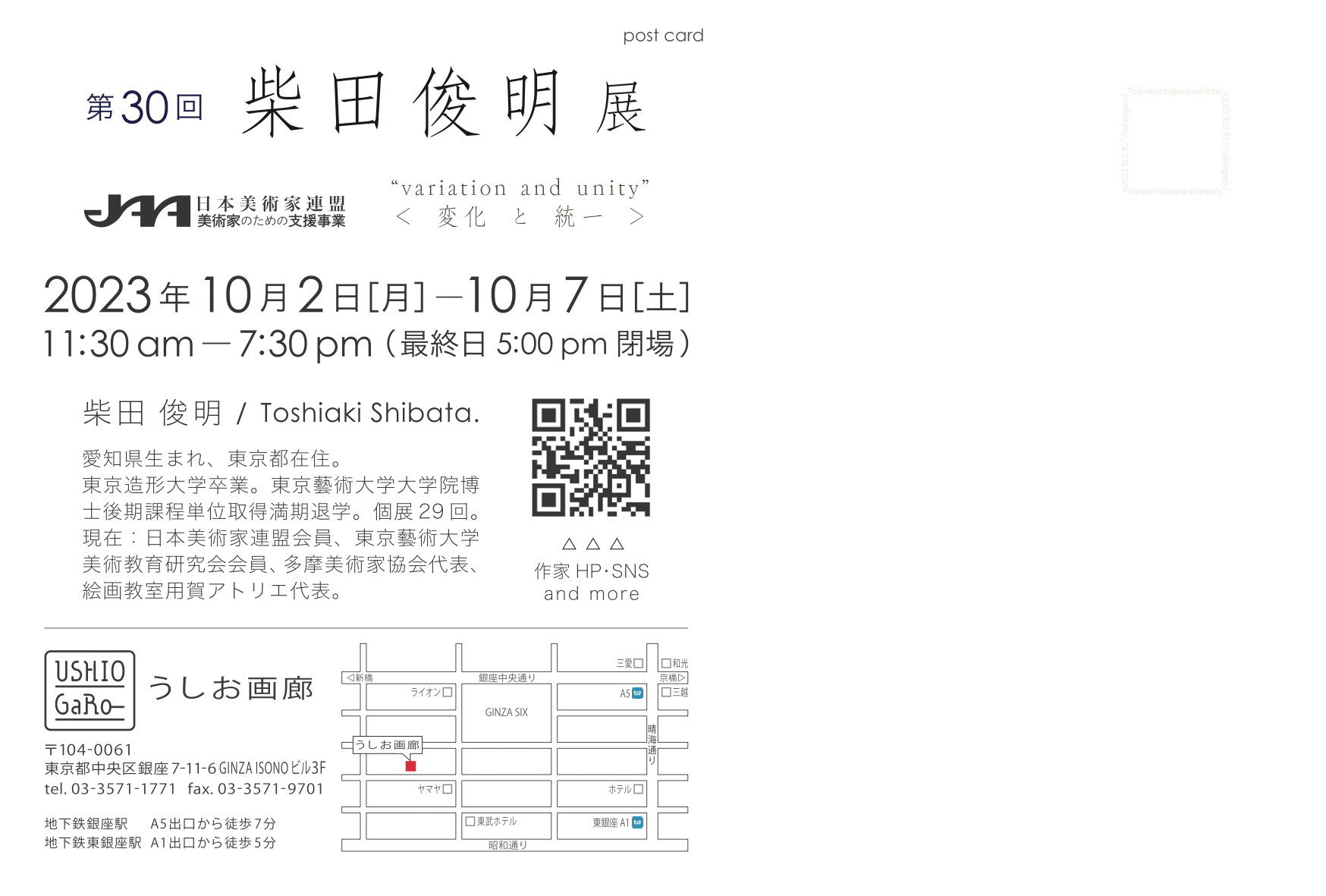 ニュース 柴田 俊明 個展 「変化と統一」 多摩美術家協会代表・柴田俊明が以下の通り個展を開催致します。この展覧会は作家30回目の個展にあたり、日本美術家連盟の「美術家のための支援事業」によるものです。 是非ご高覧下さい。 第30回 柴田俊明 展“ Variation and Unity ” ニュース, 個展 関連記事一覧 2025年8月25〜30日 清田 悠紀子 展 ─おぼろげな光と影のあわいに─ 2024年3月1~6日 島田八重子 「夢のイストワール展 Part 8」 2024年5月16〜26日 西谷直子 個展 Line Lands 2024年4/20~5/11 新川ありさ 個展 『虹を生きる詩-わたしの心... 中野 愛菜 個展 光ノ透 -Hikari no tou- 2025年12月8〜13日 金 大偉 特別絵画展『火と水と風の対話 』