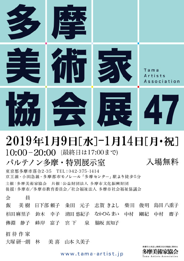 2019年1月9〜14日 第47回多摩美術家協会展 新会員推挙 新会員推挙 最近のお知らせ一覧お知らせ一覧 新会員推挙 2025年6月30日〜7月19日 多摩美術家協会ゆう桜ヶ丘展 第53回多摩美術家協会展の様子 2025年5月24日 [イベント] わくわく肖像ドローイング/第53回多摩美術家協会展イベント 2025年5月19〜25日 第53回 多摩美術家協会展