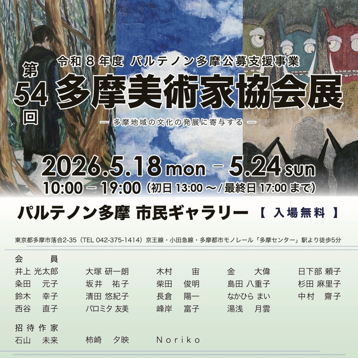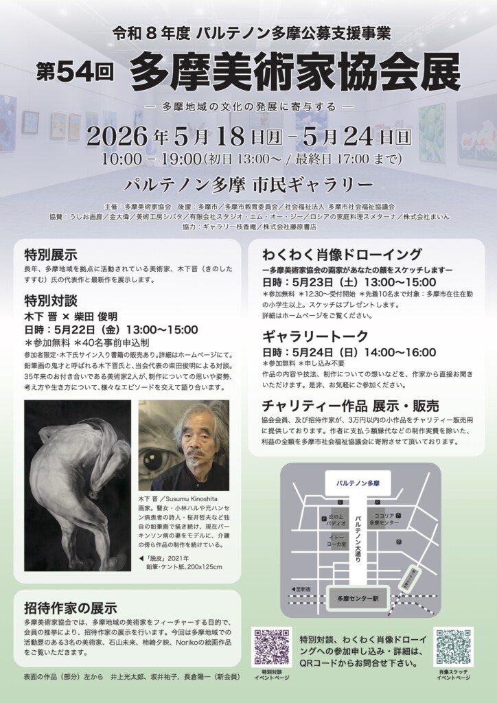 第54回多摩美術家協会展が、令和8年度パルテノン多摩公募支援事業として、5月18日よりパルテノン多摩市民ギャラリーにて開催されます。今回は会期中、長年多摩地域を拠点に活動されてきた画家・木下 晋(きのした すすむ)氏の作品の特別展示を開催し、木下氏と柴田 俊明 協会代表による特別対談を行います。例年通り、多摩美術家協会会員および招待作家の作品展示、ギャラリートーク、会員によるスケッチイベント、チャリティー作品展示・販売がございます。ぜひ会場にてご高覧ください。